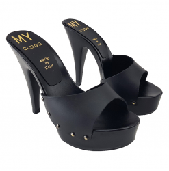 HOLZEFFEKT CLOGS MIT FARBBAND SCHWARZ AUS LEDER, ABSATZHÖHE 13 CM UND 4 CM PLATEAU. HANDWERKLICHE VERARBEITUNG. STABIL UND BEQUEM, WERDEN SIE VOLLSTÄNDIG IN ITALIEN HERGESTELLT.