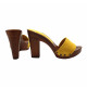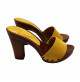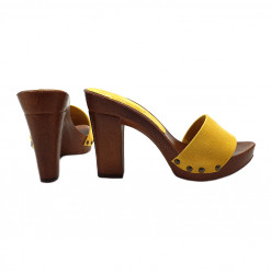 CLOGS MIT HOLZEFFEKT PLATTFORM UND FARRBAND AUS GELBEM WILDLEDER. ABSATZHÖHE 10 CM + 2 CM PLATEAU, SEHR KOMFORTABEL UND ELEGANT VINTAGE STIL. HOLZSCHUHE VÖLLIG IN ITALIEN HERGESTELLT.