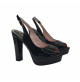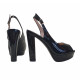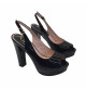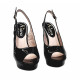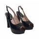 Open-toe Schuhe aus schwarzem Lackleder. Abasatzhöhe 12,5 cm + 3 cm Plateau. Regulierbarer Knöckelriemen. Handwerkliche Verarbeitung. Stabil und bequem, werden sie vollständig in Italien hergestellt.