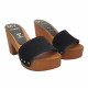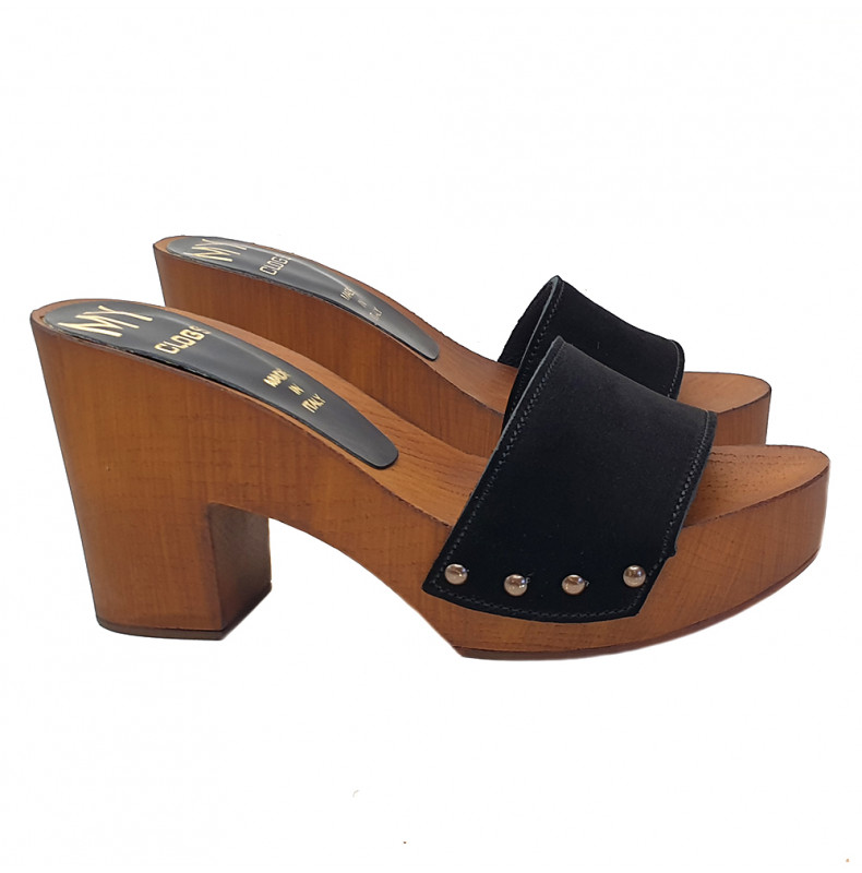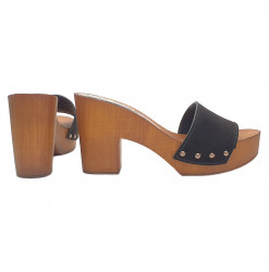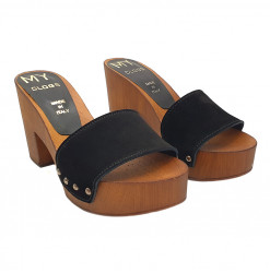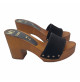 Holzeffekt Clogs mit Farbband aus Schwarz Wildleder völlig in Italien hergestellt. Absatzhöhe 9 cm und 3 cm Plateau, sehr bequem und stilvoll. Handwerkliche Verarabeitung.