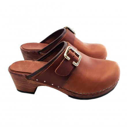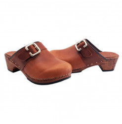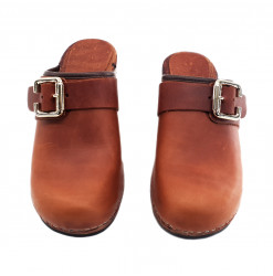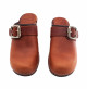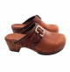 Schwedische Holzeffekt Clogs mit Oberleder braun aus Leder mit Schnalle verfeinert, völlig in Italien handarbeit von Fachkräfte. Absatzhöhe 5 cm, sehr komfortabel und stilvoll.