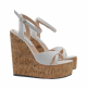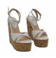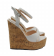 CLOGS MIT KEILABSATZ AUS KORK UND WEISSEM BAND. VERSTELLBARER KNÖCHELRIEMEN. ABSATZHÖHE 14 CM UND PLATTFORM 4 CM, SEHR BEQUEM VOLLSTÄNDIG IN ITALIEN VON PROFIS HERGESTELLT.