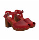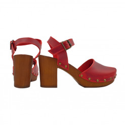 HOLZSCHUHE MIT FARBBAND AUS LEDER ROT MIT OPEN TOE UND REGULIERBAREM KNÖCKELRIEMEN. RUTSCHFESTE SOHLE. ABSATZHÖHE 8 CM UND PLATEAU 2 CM. HANDWERKLICHE VERARBEITUNG.