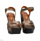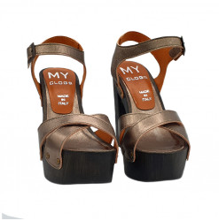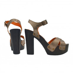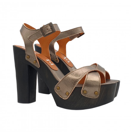 HOLZSCHUHE MIT FARBBAND BRONCE AUS LEDER MIT REGULIERBAREM KNÖCKELRIEMEN. RUTSCHFESTE SOHLE. ABSATZHÖHE 12 CM UND PLATEAU 4 CM. HANDWERKLICHE VERARBEITUNG.