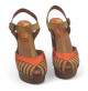 Sandalen mit kühnem und femininem Design, geprägt von einer eleganten Kombination aus braunem Leder und Details aus metallischem Kupferleder. Die Holzoptik-Struktur und der Riemen mit Schnalle verleihen ihnen einen Vintage-Look der 70er Jahre – perfekt für alle, die auffallen möchten.