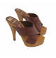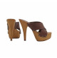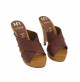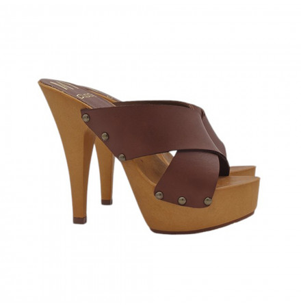 Italian clog with wood effect toffee base Crossed bands in real leather Heel height 13 centimeters with 4 centimeter platform These leather clogs, with their refined wood-effect structure and vertiginous heel, are a must-have for women who love sophisticated and timeless style.