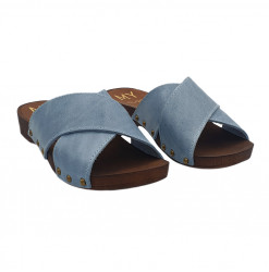 SANDALETAS BAJAS CON FONDO CÓMODO Y SUPERIOR DE CUERO AZUL CLARO. TACÓN DE 2 CM, APTO PARA LARGAS PASEOS