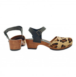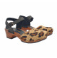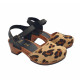 SANDALIAS ITALIANO CON BASE EFECTO MADERA MARRÓN Y SUPERIOR DE CUERO CON ESTAMPADO DE LEOPARDO. CORREA NEGRA AJUSTABLE. FABRICADO TOTALMENTE POR PERSONAL ESPECIALIZADO ITALIANO, ALTURA TACÓN 5 CENTIMETROS CON PLATAFORMA 2 CENTIMETROS.
