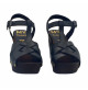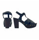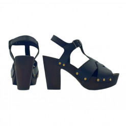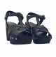 SANDALIAN CON SUELA EFECTO MADERA ANTIDESLIZANTE. CORTE TRENZADO EN CUERO NEGRO ABIERTO FRENTE. CORREAS AJUSTABLES PARA LOS TOBILLOS. TACÓN 9 CM Y PLATAFORMA 3 CM. REALIZACIÓN ARTESANA.