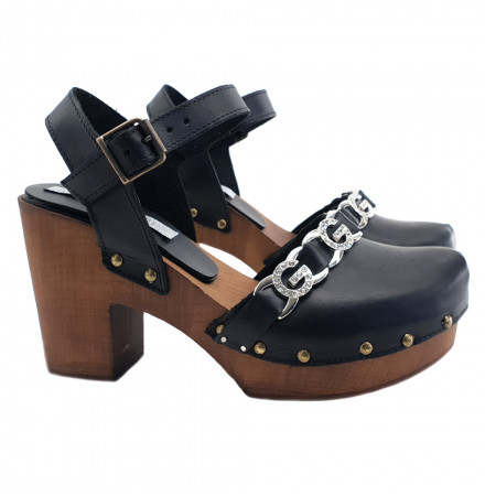 ZUECOS EFECTO MADERA Y SUELA ANTIDESLIZANTE. SUPERIOR DE CUERO NEGRO Y TIRANTE AJUSTABLE EN EL TOBILLO. TACÓN ALTO 9 CM Y PLATAFORMA 3 CM. PUNTO DE PUNTO DE CORAZÓN REALIZACIÓN ARTESANA.
