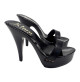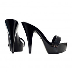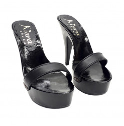 Zuecos con base negro brillo y banda de cuero negro de 2 cm.