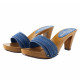 ZUECOS CON BASE DE EFECTO MADERA Y PARTE SUPERIOR MEZCLILLA. CONFECCIONADO ÍNTEGRAMENTE POR PERSONAL ESPECIALIZADO ITALIANO, ALTURA TACÓN 8 CM. CÓMODO Y ELEGANTE, ADECUADO PARA LARGOS PASEOS DE VERANO.