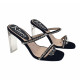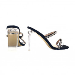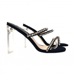 SANDALIAS CRYSTAL CON TACÓN RECTANGULAR TRANSPARENTE Y BANDAS NEGRAS CUBIERTAS DE PIEDRAS BRILLANTES. PLANTILLA ACOLCHADA. ALTURA DEL TACÓN 11 CM. PRODUCCIÓN ARTESANAL HECHA EN ITALIA