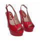 SANDALIA DE PUNTA ABIERTA DE CHAROL ROJO CON CORREA EN EL TOBILLO. TACÓN DE 12,5 CM Y PLATAFORMA DE 3 CM. ARTESANÍA