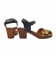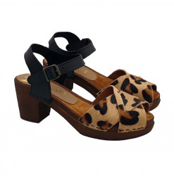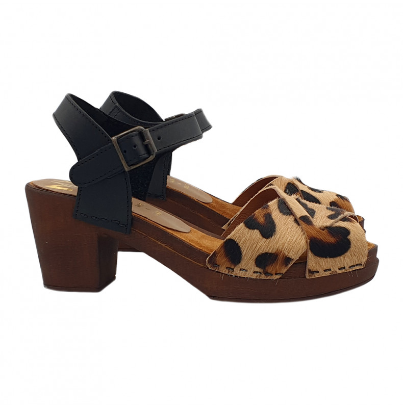 ZUECOS CON SUELA EFECTO MADERA ANTIDESLIZANTE. SUPERIOR DE CUERO ESTAMPADO DE LEOPARDO. CORREA AJUSTABLE PARA EL TOBILLO. TACÓN DE 6,5 CM Y PLATAFORMA DE 2 CM. REALIZACIÓN ARTESANA.