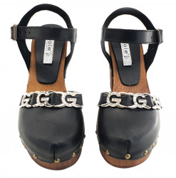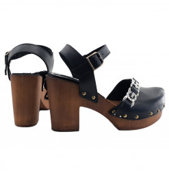 SABOTS EFFET BOIS AVEC SEMELLE ANTIDÉRAPANTE. TIGE EN CUIR NOIR ET SANGLE DE CHEVILLE RÉGLABLE. TALON HAUT 9,5 CM ET PLATE-FORME 3 CM. PIED DE CŒUR. RÉALISATION ARTISANALE.