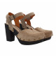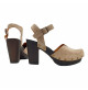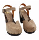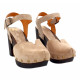 SABOTS EFFET BOIS AVEC SEMELLE ANTIDÉRAPANTE. TIGE EN DAM BEIGE ET SANGLE DE CHEVILLE RÉGLABLE. TALON HAUT 9 CM ET PLATE-FORME 3 CM. PIED DE CŒUR. RÉALISATION ARTISANALE.