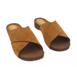 SABOTS BAS AVEC BASE EFFET BOIS ET TALON 3 CM. BANDES CROISÉES EN DAIM. CONFORTABLE ET ÉLÉGANT.