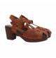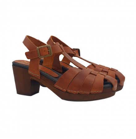 SABOTS AVEC SEMELLE EFFET BOIS ANTIDÉRAPANTE. TIGE TRESSEE EN CUIR COULEUR MARRONE. SANGLES DE CHEVILLE RÉGLABLES. TALON HAUT 7 CM ET PLATE-FORME 2 CM. RÉALISATION ARTISANALE.