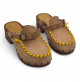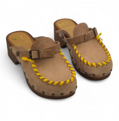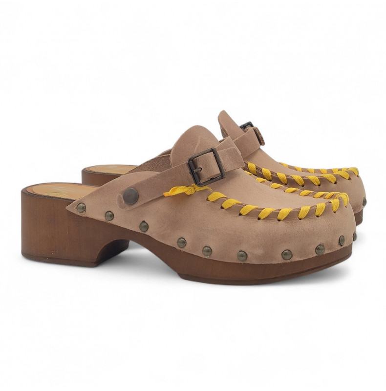 La tige fermée, ornée de surpiqûres contrastées couleur moutarde, apporte une touche artisanale authentique, tandis que la structure effet bois assure stabilité et légèreté à chaque pas.