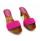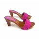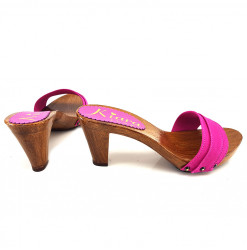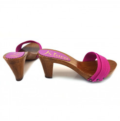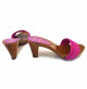 ZOCCOLO ITALIANO CON BASE EFFETTO LEGNO E TOMAIA FUXIA. REALIZZATA INTERAMENTE DA PERSONALE ITALIANO SPECIALIZZATO, ALTEZZA TACCO 8 CENTIMETRI. COMODO ED ELEGANTE, ADATTO A LUNGHE PASSEGGIATE.