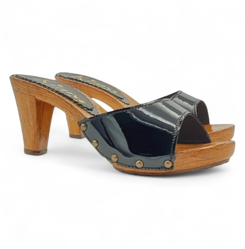Zoccoli donna italiani con fascia in vernice nera e tacco 8cm
